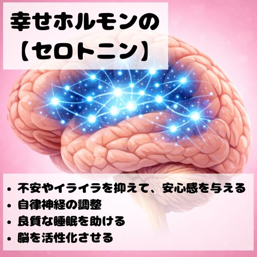 セロトニンは、別名「幸せホルモン」と呼ばれる神経伝達物質です。このホルモンは、心の安定やストレス軽減、自律神経の調整など、